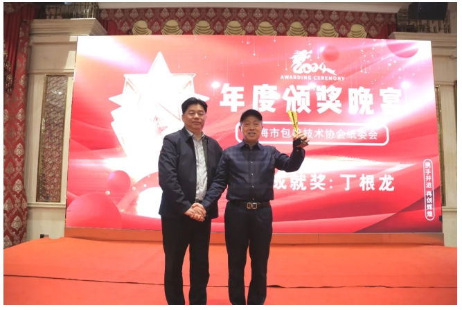 憑借過硬的產(chǎn)品品質(zhì)、齊全的解決方案和優(yōu)秀的服務(wù)能力,上海鼎龍機(jī)械有限公司持續(xù)引領(lǐng)紙箱機(jī)械發(fā)展,在業(yè)內(nèi)享受盛譽(yù)。年會(huì)晚宴上,上海包協(xié)紙委會(huì)為上海鼎龍機(jī)械有限公司創(chuàng)始人及董事長(zhǎng)丁根龍先生頒發(fā)“終身成就獎(jiǎng)”,以表彰其數(shù)十年對(duì)行業(yè)的卓越貢獻(xiàn)。